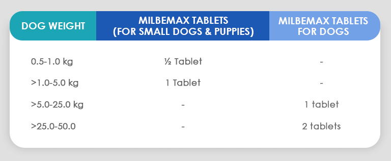 Before using Milbemax on dogs, check with your vet to confirm your dog is not infected with heartworms. - The standard recommended dose of Milbemax is 0.5 mg milbemycin oxime, and 5 mg praziquantel per kg bodyweight.