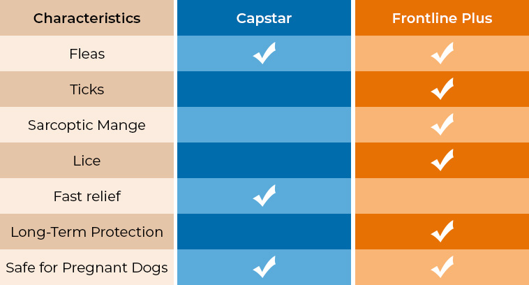 With the above overview, you can ascertain that both Capstar and Frontline Plus offer reliable protection against fleas. The following chart will help you understand the parasites covered by these treatments and hint at their compatibility.