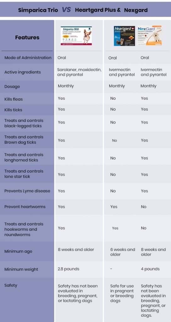 Here is the comparison table of product features of Simparica Trio and Heartgard Plus+NexGard :